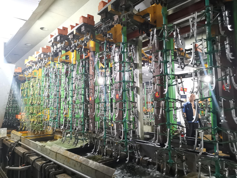 Bild 1 zeigt den Rohgusszustand der Knoblauchpresse. Nach der Grobbearbeitung wird sie manuell poliert. Bild 3 zeigt dann das Teil, nachdem es durch eine automatisierte 180-Grad-Hochtemperatur-Galvanisierungsproduktionslinie behandelt wurde. Schließlich werden die qualifizierten Komponenten zusammengebaut.