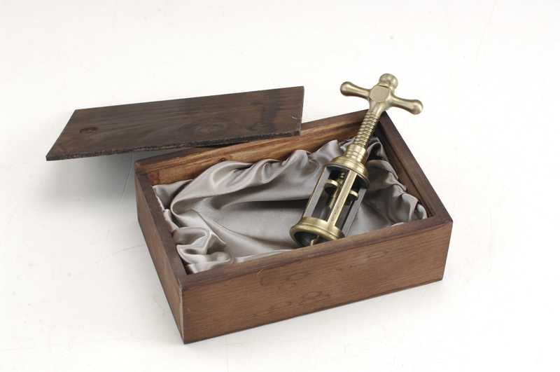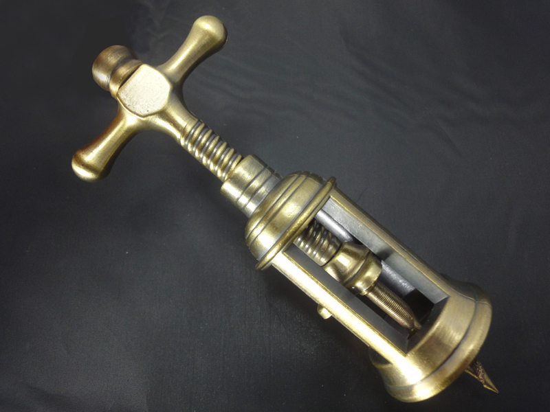 Dieser Weinöffner bietet eine einzigartige Abkehr von herkömmlichen Designs und zeichnet sich durch zwei herausragende Elemente aus: seine antike Messingpatina und den spiralförmigen Korkenziehmechanismus. Die gealterte Oberfläche vermittelt ein Gefühl zeitloser Handwerkskunst, während das innovative Spiraldesign ein müheloses und elegantes Entkorken gewährleistet.