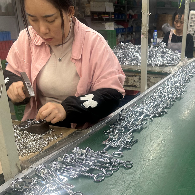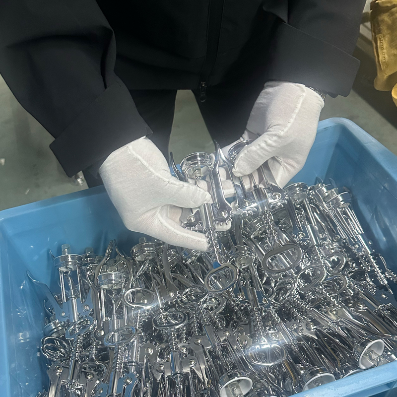 Für die Beschichtung aller Komponenten des Korkenziehers werden in der Regel Galvanisierungs- oder Lackierverfahren verwendet. In dieser Darstellung konzentrieren wir uns auf die Galvanisierung. Die Galvanisierungsverarbeitung wird von einem externen Lieferanten durchgeführt, der hochspezialisierte Anlagen, Geräte und Industrieingenieure mit jahrelanger Erfahrung auf ihrem Gebiet sowie zahlreiche einfache Techniker und erfahrene Arbeiter erfordert. Es handelt sich um einen sehr komplexen Prozess. Wir pflegen eine langfristige Zusammenarbeit mit Lieferanten, die über 30 Jahre Branchenerfahrung verfügen, um die Produktstabilität sicherzustellen. Dadurch wird auch sichergestellt, dass verschiedene Produktionsprobleme, die während der Herstellung auftreten, schnell, professionell und effizient gelöst werden können. Diese Vorkehrungen tragen dazu bei, die Produktionszyklen für Artikel wie Weinzubehör, Küchengeschirr und Korkenzieher sicherzustellen und gleichzeitig die Verkaufspläne der Kunden zu unterstützen.