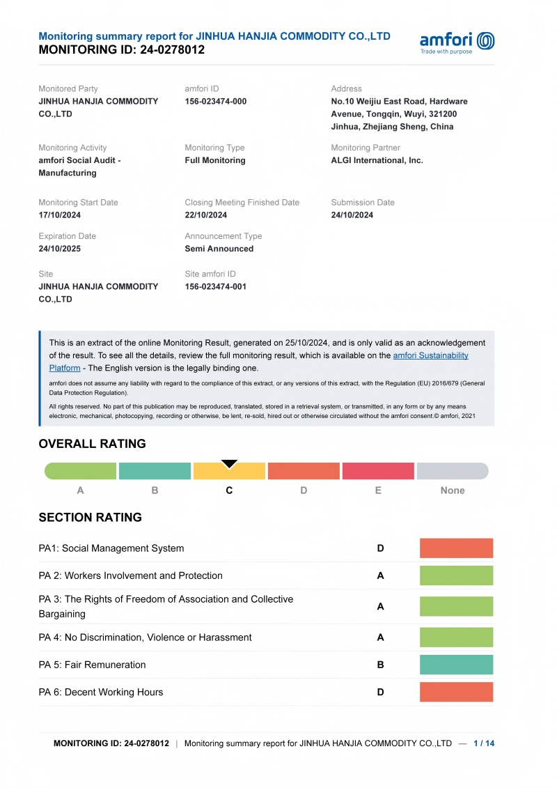 Im Juli 2025,Jinhua Hanjia Commodity Co., Ltd.erfolgreich eine C-Level-Zertifizierung in der Factory Audit-Programm der Internationalen Klassifizierung für Standards (ICS) erhalten, die von der von der Genossenschaft Ensgene ernannten Europäischen Inspektionsagentur von Drittanbietern durchgeführt wurde. Dieses Zertifizierungssystem umfasst vier Ebenen: A, B, C und D. Als Mitglied der französischen Handelskammer und der Industrie (FCD) hält das Unternehmen den Standard -SA8000 der Internationalen Labororganisation des Social Management Scheme des Social Management -Programms des Social Managements des Social Managements in der Umsetzung sozialer Verantwortung für die Audits für soziale Verantwortung.