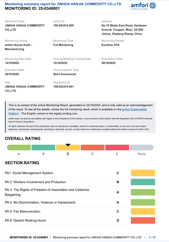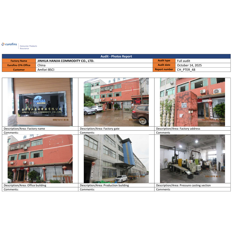 Jinhua Hanjia Commodity Co., Ltd. hat die Ergebnisse seines BSCI-Audits veröffentlicht. Am 14. Oktober hat das Unternehmen die professionelle Bewertung erfolgreich bestanden und eine Klasse-C-Zertifizierung erhalten, die den vom Kunden angegebenen Mindestanforderungen entspricht. Die Gültigkeitsdauer dieser Zertifizierung beträgt ein Jahr. Das BSCI-Audit wurde von der vom Kunden ausgewählten EUROFINS-Agentur durchgeführt. Dieser Kunde kauft seit langem Weinöffner, Weinzubehör und Edelstahlprodukte wie Cocktailshaker von unserem Unternehmen. Das Land des Kunden verlangt von Lieferanten, dies zu tun über diese Zertifizierung verfügen.
