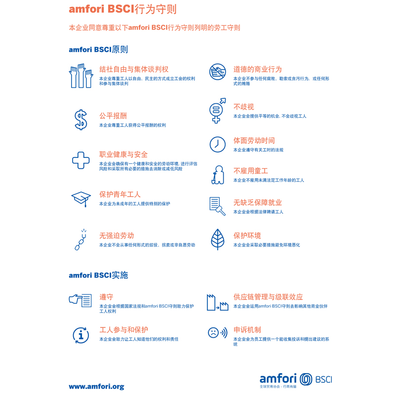 Gemäß den Anforderungen der BSCI-Vorschriften hält sich unser Unternehmen strikt an die im Amfori BSCI-Verhaltenskodex dargelegten Arbeitsrichtlinien, um die wirksame Umsetzung der BSCI-Grundsätze sicherzustellen. Während des Produktionsprozesses respektieren wir das Recht der Arbeitnehmer, auf freie und demokratische Weise Gewerkschaften zu gründen und an Tarifverhandlungen teilzunehmen. Wir verpflichten uns außerdem zur Nichtdiskriminierung, vermeiden den Einsatz von Kinderarbeit und stellen sicher, dass die Arbeitnehmer faire Arbeitspraktiken und Vergütungen erhalten. Darüber hinaus garantieren wir, dass Arbeitnehmer angemessene Arbeitszeiten und andere Grundrechte haben.